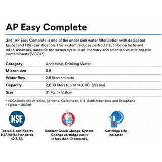3 M Ap Easy C Complete. The C-Cyst-FF cartridge is for use with the AP Easy Cyst-FF water filtration system. The universal housing design allows for use on chlorinated (municipal) and non-chlorinated (well water) systems. C-COMPLETE Cartridge for AP Easy Complete '*NSF International is an independent lab that ensures all drinking water systems are tested and certified to meet strict public health and safety standards. The compact AP Easy Complete system connects to a dedicated drinking water faucet (included). You can find help desk contact information below. 3 M Ap Easy C Complete.